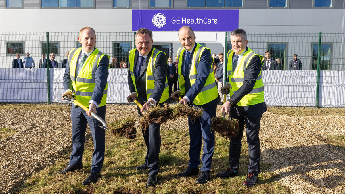 Michael Lohan, CEO of IDA Ireland, Kevin O’Neill, President & CEO, GE HealthCare’s Pharmaceutical Diagnostics, An Taoiseach Micheál Martin and Eugene Barrett, MD of GE HealthCare Ireland, launching €132m in construction works at GE HealthCare, Carrigtohill, Cork. Pic : Darragh Kane